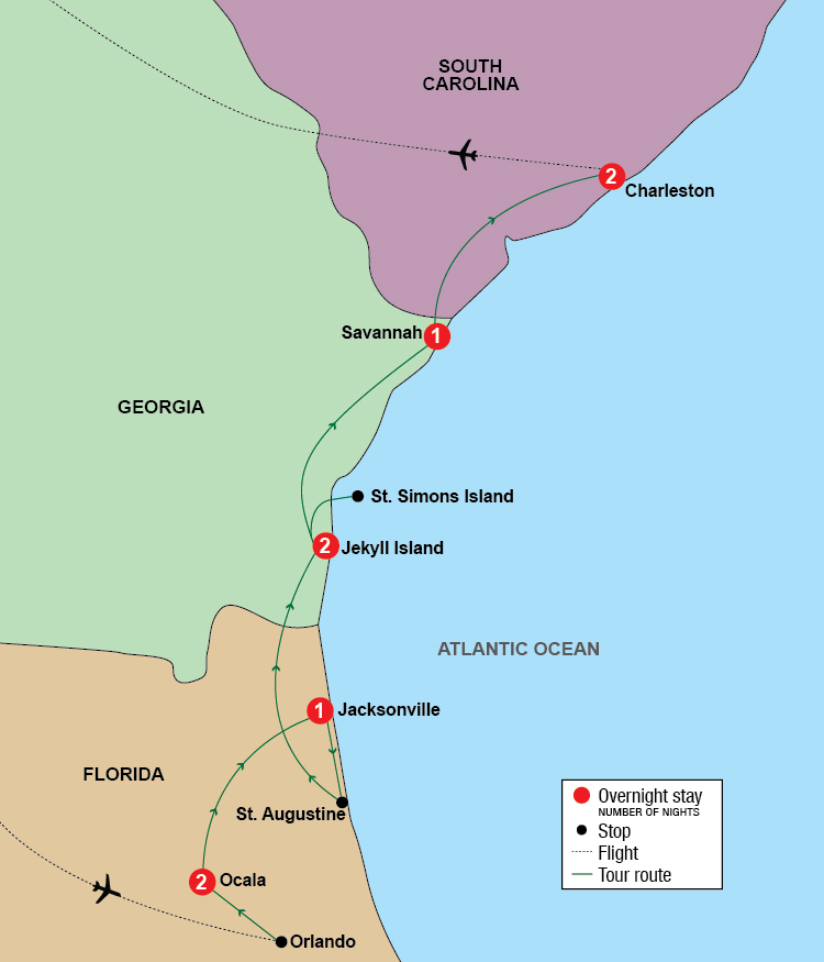 Experience southern hospitality and charm with two nights in Ocala in northern Florida's horse farm country; one night in the port city of Jacksonville, Florida; two nights at the luxurious Jekyll Island Club, Georgia; one night in historic Savannah, Georgia; and two nights in antebellum Charleston, South Carolina. To take advantage of relaxing non-stop flights, we also include a pre-night and a post-night in Seattle.